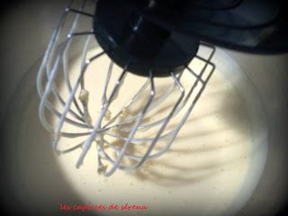 - Versez la farine mélangée à la levure en trois fois la en continuant de fouetter.